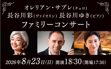 - オレリアン・サブレ(チェロ) 長谷川彩(ヴァイオリン) 長谷川ゆき(ピアノ)ファミリーコンサート 2026年8月23日(日)開催