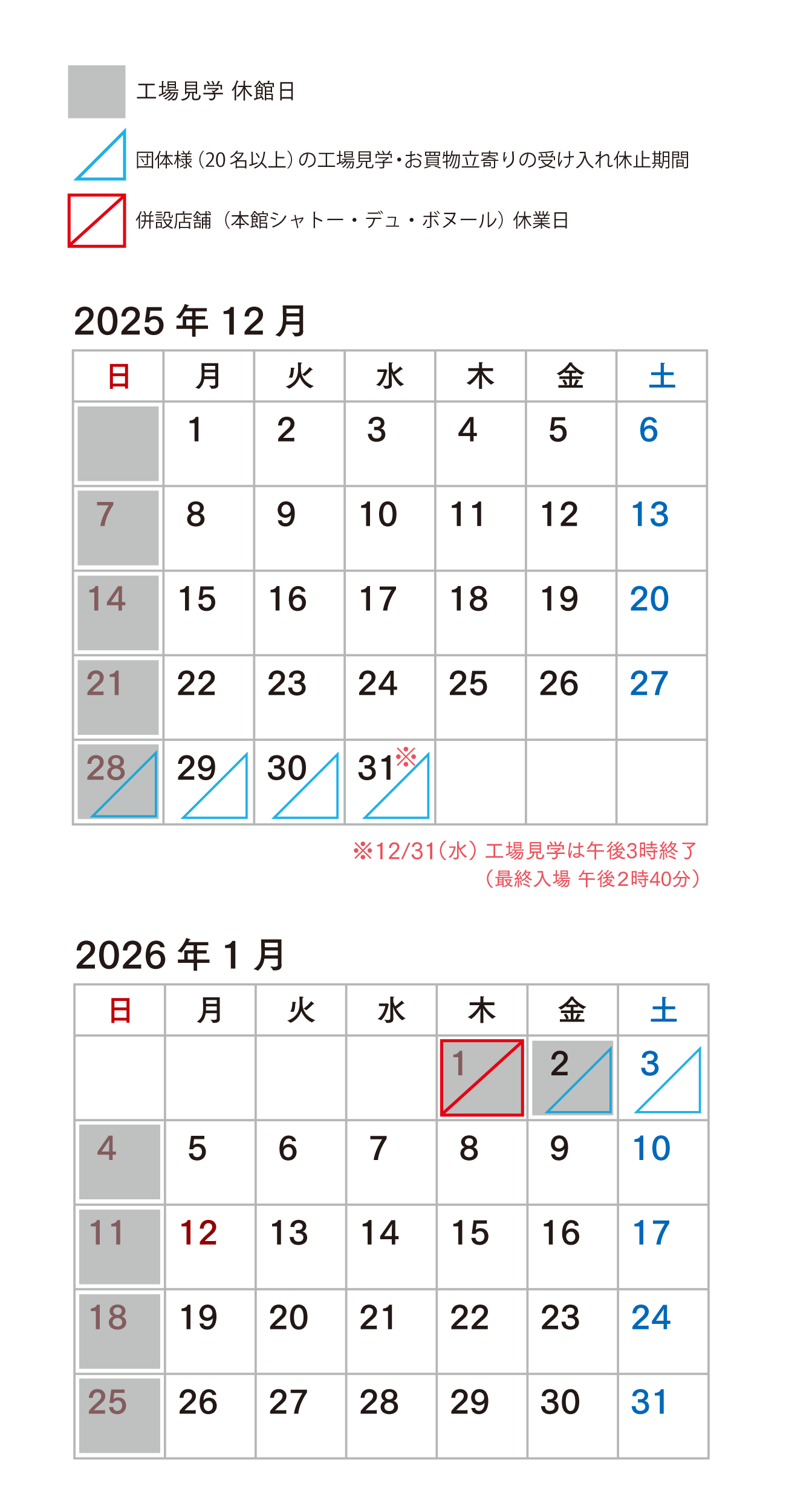 なお、誠に申し訳ございませんが、団体様の工場見学・お買物立寄りにつきましては、2025年12月28日(日) ~ 2026年1月3日(土)までお受けすることができかねますのでご了承くださいませ。
